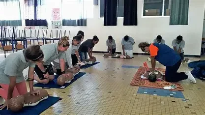 La seconde partie consiste en des ateliers pratiques, tels que le bouche-à-bouche et la réanimation cardiaque.